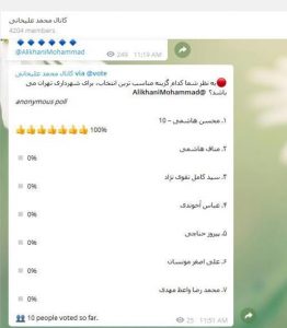در نظرسنجی کانال تلگرامی علیخانی هفت گزینه به عنوان گزینه های شهرداری تهران معرفی و به نظرسنجی عمومی گذاشته شده اند که اسامی آن ها به شرح ذیل است: