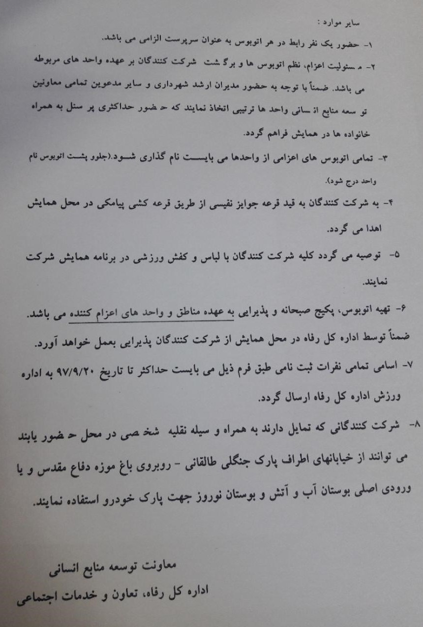 در این دستورالعمل به برگزاری این مراسم و همچنین نحوه اعزام افراد اشاره شده است اما نکتهای که در برگزاری این مراسم سوال برانگیز و تعجب آور است تاکید این معاونت بر سهمیه مناطق به طوری که در این دستورالعمل آمده است که مناطق ۲۲ گانه می بایست نسبت به ثبت نام و اعزام ۸۰نفر (دو دستگاه اتوبوس) از پرسنل به همراه خانوادههای محترم آنها و سایر واحدهای تابعه شهرداری تهران ۵۰ درصد از کل پرسنل واحد مربوطه، جهت شرکت در همایش اقدام نماید.