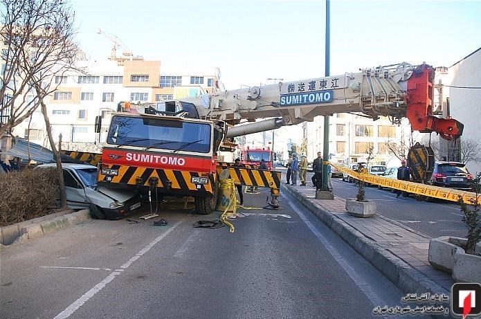حادثه عجیب در شمال تهران/ جرثقیل غول پیکری که پراید را له کرد!+تصاویر