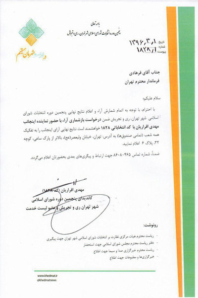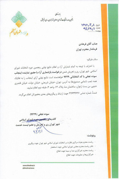 به گزارش شوراآنلاین، سوده نجفی و مهدی اقراریان از اعضای لیست خدمت با حضور در فرمانداری درخواست بازشماری آرا و ارائه آمار نهایی رای به تفکیک هر شعبه را به فرماندار تهران به صورت مکتوب ارائه کردند.