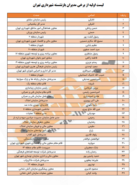 پیگیری شوراآنلاین جهت در اختیار گرفتن لیست اولیه مدیران بازنشسته شهرداری تهران از منابع مسئول بی نتیجه ماند اما بر اساس اخبار غیررسمی و پیگیری های خبرنگاران شوراآنلاین، اسامی مدیرانی که گفته می شود علیرغم بازنشستگی در شهرداری تهران مشغول بکار هستند جمع آوری شده که در اختیار مخاطبان قرار می گیرد.